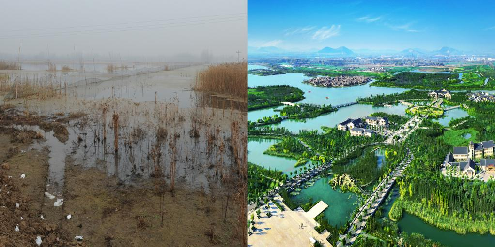 昔日的采煤塌陷區(qū)(左)被打造成濕地公園(右)(央廣網(wǎng)發(fā) 徐州市賈汪區(qū)攝影家協(xié)會供圖)