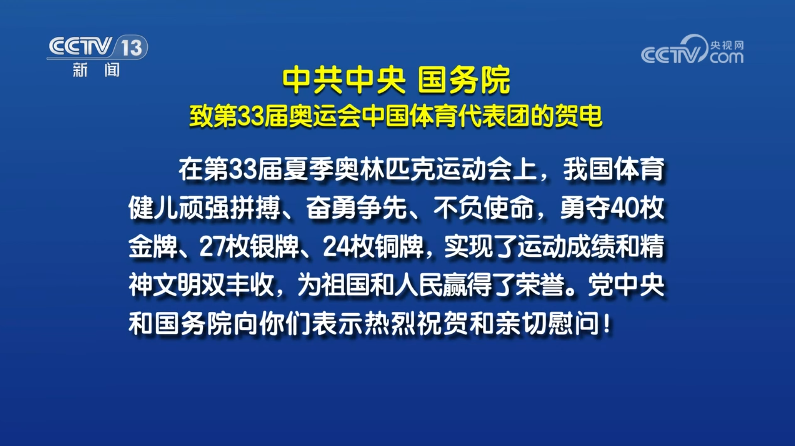 8月11日,中共中央、國務(wù)院向第33屆夏季奧運會中國體育代表團(tuán)致賀電,高度評價我國體育健兒“實現(xiàn)了運動成績和精神文明雙豐收,為祖國和人民贏得了榮譽”。賀電指出,我國體育健兒們以優(yōu)異成績和出色表現(xiàn),進(jìn)一步激發(fā)了海內(nèi)外中華兒女的愛國熱情、振奮了民族精神、凝聚了奮進(jìn)力量。