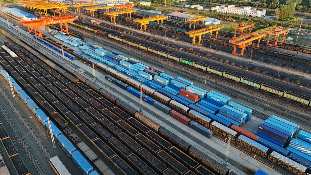 這是2024年8月14日在黑龍江綏芬河鐵路口岸集裝箱換裝場拍攝的集裝箱換裝作業(yè)現(xiàn)場(無人機照片)。今年前七個月,綏芬河鐵路口岸開行中歐班列573列,運量達55246標箱,同比分別增長23%和18%,班列數(shù)量持續(xù)保持高位運行。