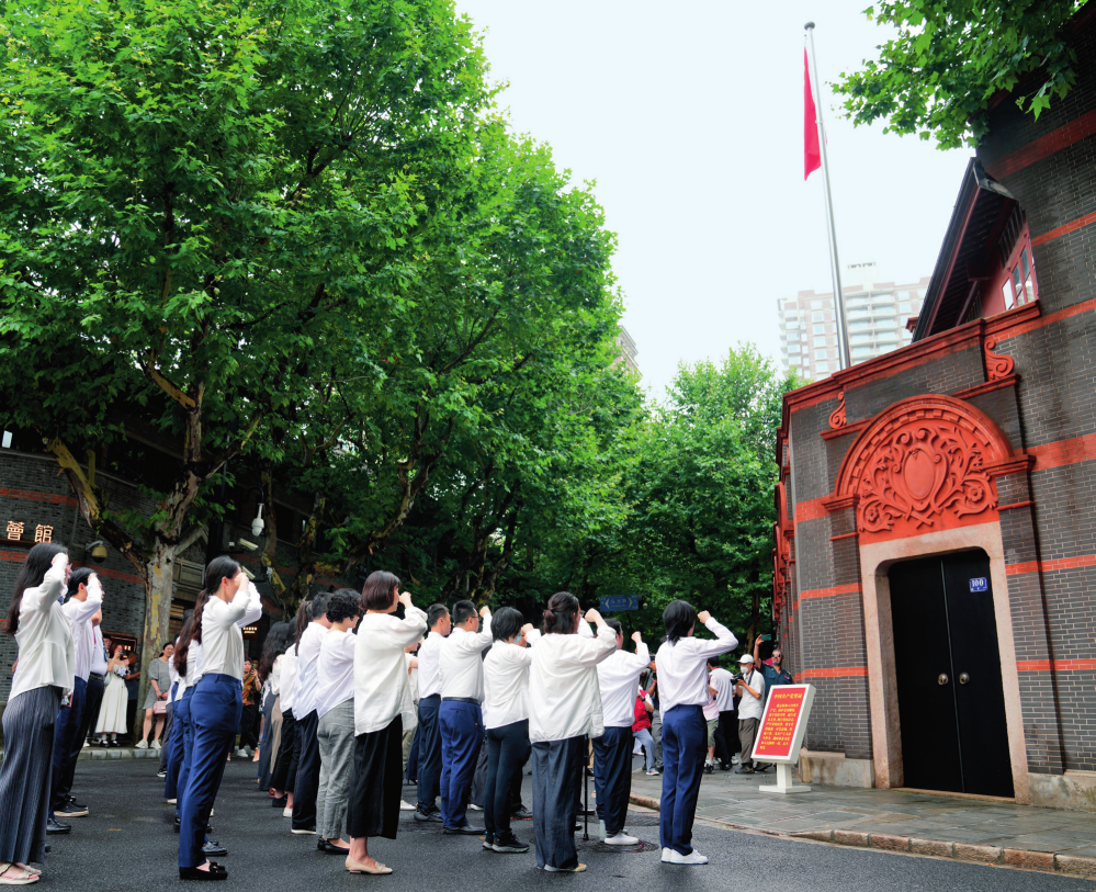 中共一大紀(jì)念館的黨員在一大會(huì)址前重溫入黨誓詞(2024年7月1日攝) 劉穎攝 / 本刊