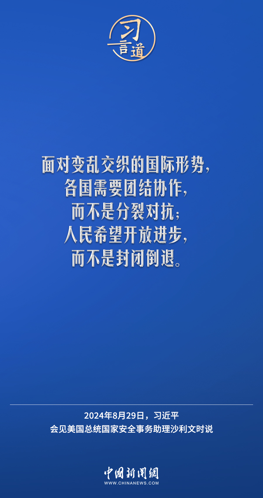 8月29日,國家主席習(xí)近平在北京人民大會堂會見美國總統(tǒng)國家安全事務(wù)助理沙利文。習(xí)近平指出——