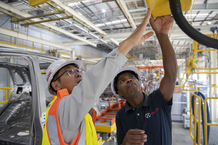 2023年5月9日,在南非東開普省北汽南非工廠,電工邦加尼(右)與中國同事方龍在焊裝車間內(nèi)工作。新華社記者 張譽東 攝