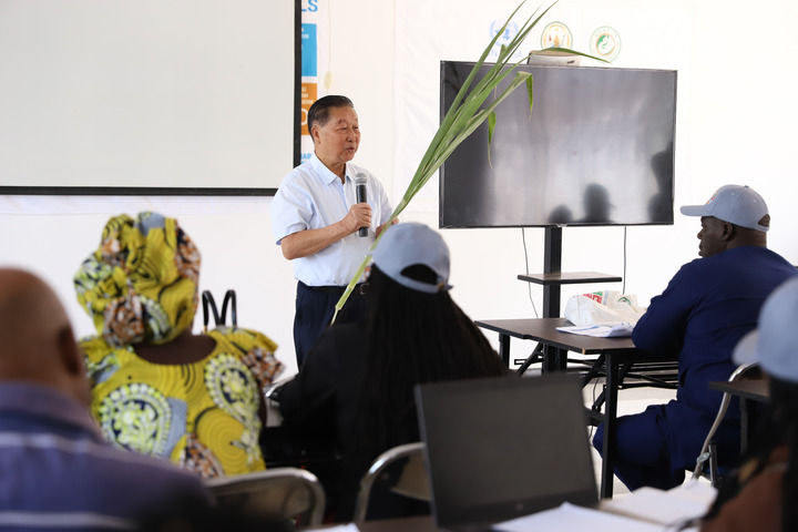2024年8月4日,在位于盧旺達南方省胡耶區(qū)的中國援盧農(nóng)業(yè)技術(shù)示范中心,菌草發(fā)明人林占熺為培訓(xùn)班學(xué)員講解菌草技術(shù)。新華社發(fā)(黃萬晴攝)