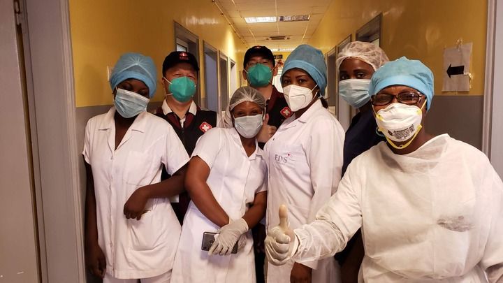 2020年5月26日,中國抗疫醫(yī)療專家組在剛果(布)首都布拉柴維爾指導(dǎo)新冠肺炎病房建設(shè)時,與當(dāng)?shù)匾痪€醫(yī)務(wù)人員合影。新華社發(fā)