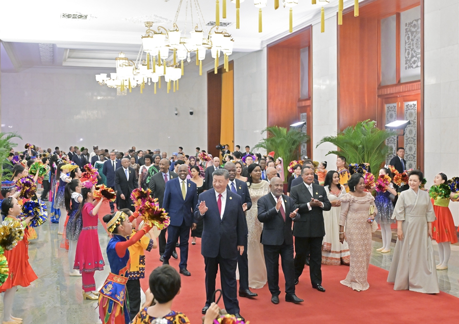 宴會(huì)后,習(xí)近平和彭麗媛同貴賓們共同觀看《攜手同行,共筑未來(lái)》文藝演出。演出展現(xiàn)了中非多彩文明美美與共、中非人民相知相親,贏得陣陣熱烈掌聲。