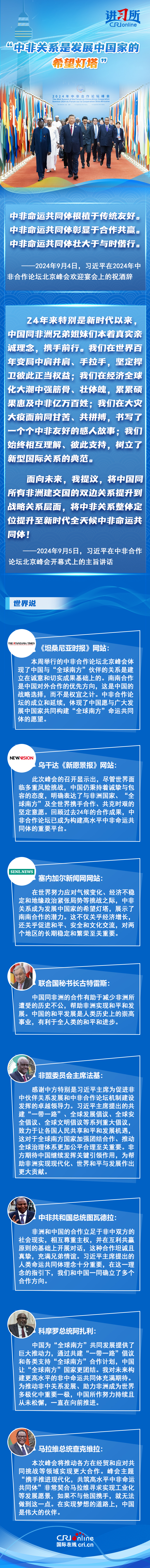 從宣布建立“新型伙伴關(guān)系”,到整體定位提升至“新時代全天候中非命運共同體”,成立24年的中非合作論壇不斷推動中非關(guān)系實現(xiàn)跨越式發(fā)展,特別是新時代以來,中國本著真實親誠理念,同非洲兄弟姐妹們攜手前行,受到非方廣泛稱贊。非方各界認為,為推動非中關(guān)系發(fā)展、助力非洲成為世界多極化中重要一極,中國所作努力持續(xù)且從未松懈,中非關(guān)系是發(fā)展中國家的希望燈塔。