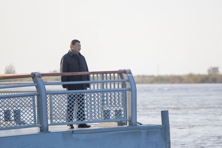 2021年10月20日,中共中央總書記、國家主席、中央軍委主席習(xí)近平在東營市黃河入??诳疾臁P氯A社記者 王曄 攝