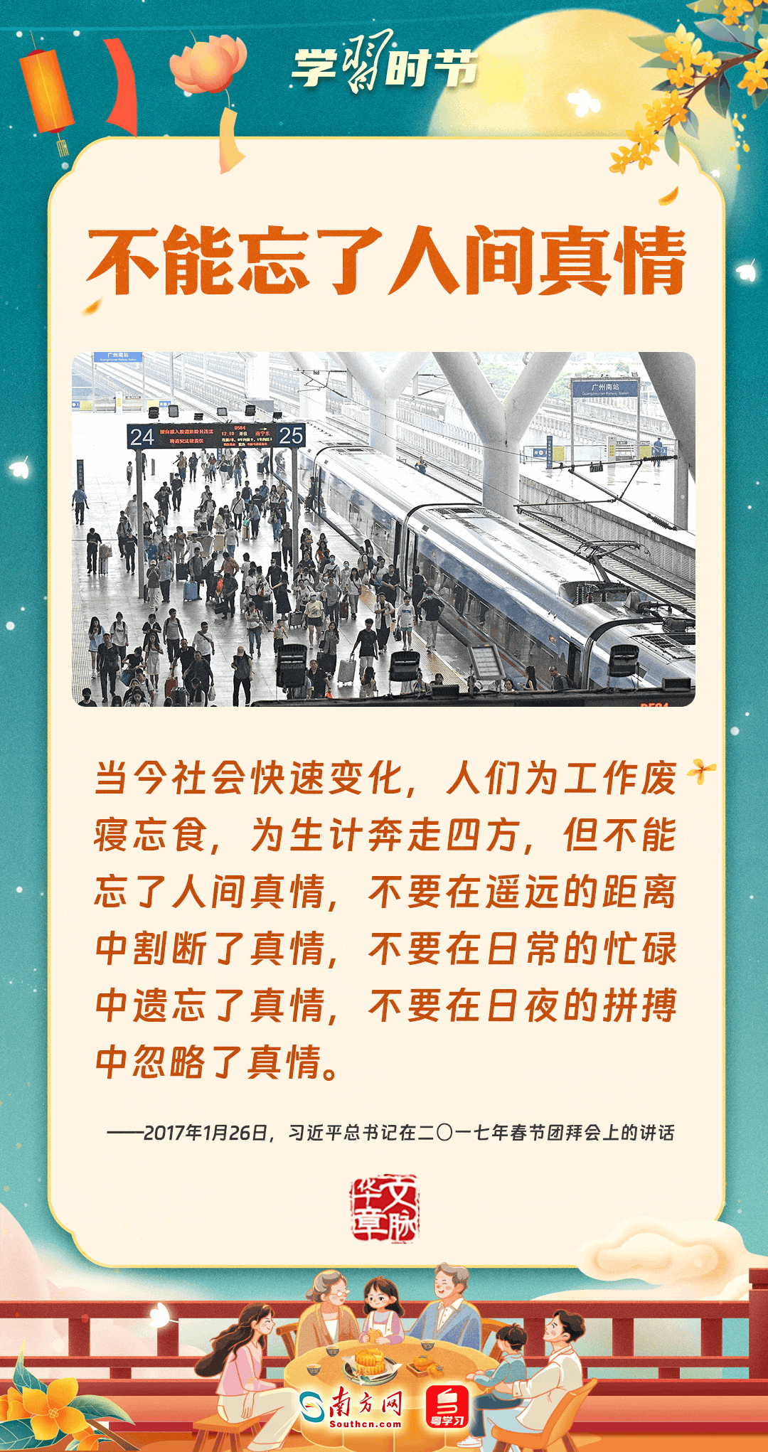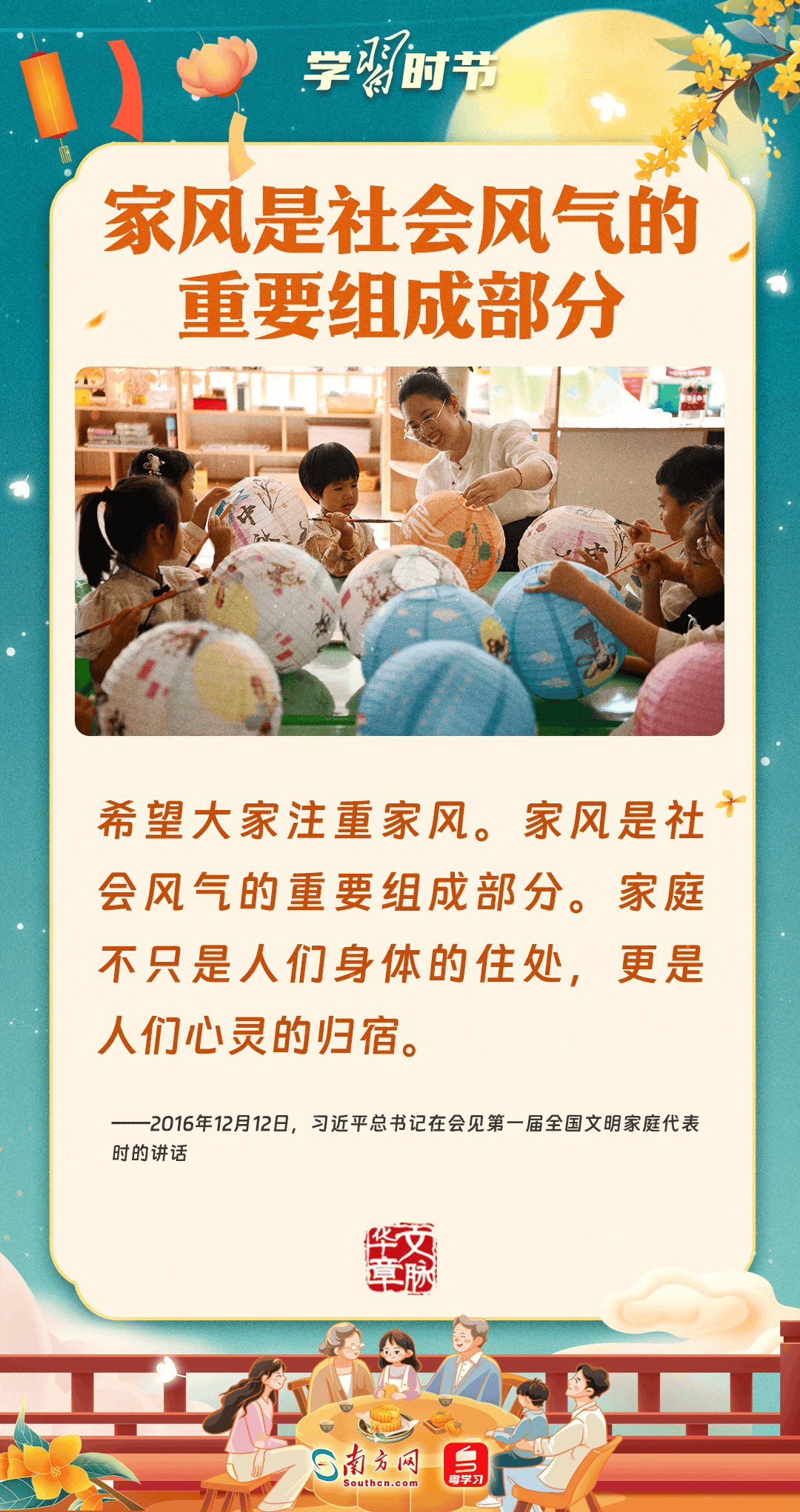 明月寄相思,家國總關(guān)情。作為中華優(yōu)秀傳統(tǒng)文化的重要載體之一,中秋節(jié)不但寄托著海內(nèi)外華人對(duì)闔家團(tuán)圓的美好期許,還承載著深厚的故鄉(xiāng)情、家國情。習(xí)近平總書記曾在多個(gè)場(chǎng)合深刻闡述個(gè)人、家庭與國家之間的關(guān)系,強(qiáng)調(diào)要厚植家國情懷,把實(shí)現(xiàn)個(gè)人夢(mèng)、家庭夢(mèng)融入國家夢(mèng)、民族夢(mèng)之中。中秋佳節(jié),讓我們一起回顧總書記那些經(jīng)典話語,共同感受他至深至厚的家國情懷。