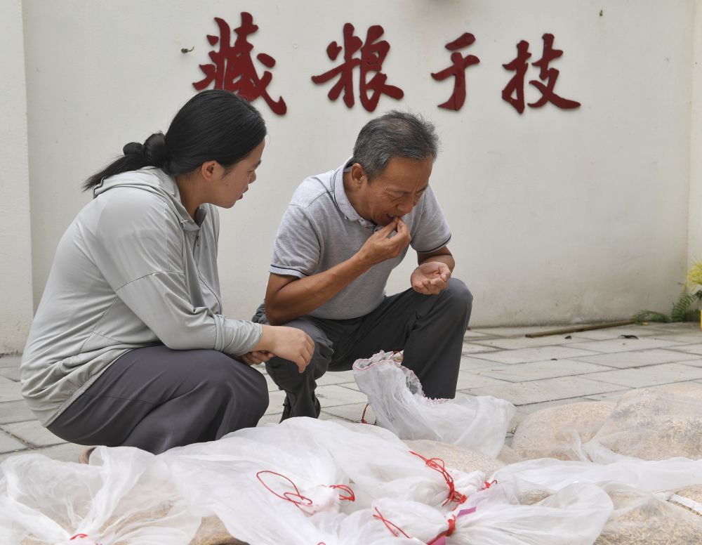 2024年8月22日,在永豐村水稻科技小院,長(zhǎng)期駐守在此的四川農(nóng)業(yè)大學(xué)學(xué)生測(cè)量稻谷含水量。