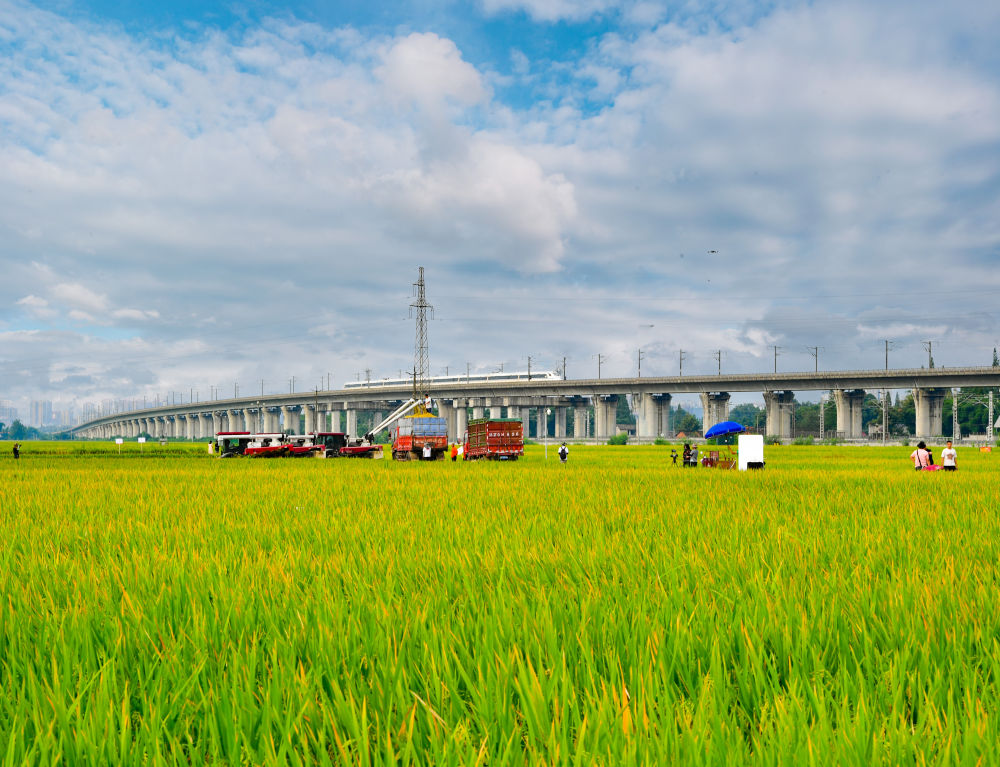 2023年8月28日,收割機(jī)在永豐村高標(biāo)準(zhǔn)農(nóng)田內(nèi)收割水稻。十多年來(lái),科研團(tuán)隊(duì)從500余個(gè)省內(nèi)外優(yōu)良品種中篩選出29個(gè)適合當(dāng)?shù)胤N植的高產(chǎn)、優(yōu)質(zhì)、宜機(jī)化品種在眉山當(dāng)?shù)卮竺娣e應(yīng)用。