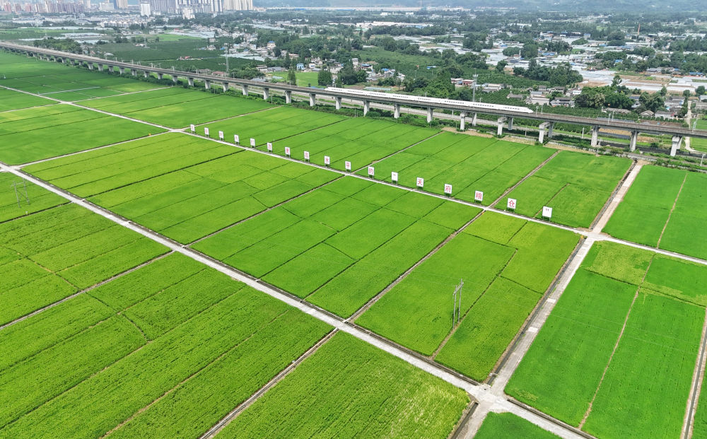 2024年7月26日,一列高鐵列車從永豐村高標(biāo)準(zhǔn)農(nóng)田上方的高架橋上疾馳而過(guò)(無(wú)人機(jī)照片)。過(guò)去,永豐村的農(nóng)田不少是“巴掌田”“雞爪田”,如今,細(xì)碎零散的耕地變成了“田成方、土成型、渠成網(wǎng)、路相通、溝相連”的高標(biāo)準(zhǔn)農(nóng)田,連片農(nóng)田實(shí)現(xiàn)了全程機(jī)械化種植。