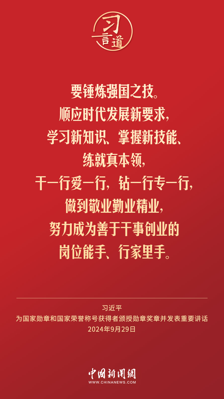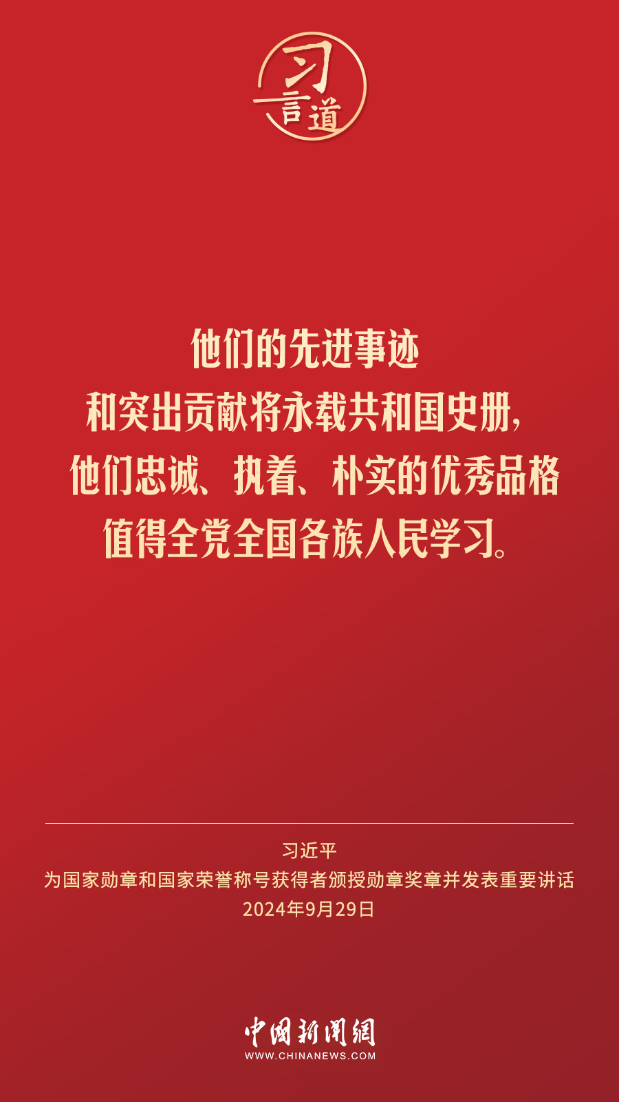 經(jīng)中共中央批準,中華人民共和國國家勛章和國家榮譽稱號頒授儀式于9月29日上午10時在人民大會堂隆重舉行。中共中央總書記、國家主席、中央軍委主席習近平向國家勛章和國家榮譽稱號獲得者分別授予“共和國勛章”“友誼勛章”和國家榮譽稱號獎?wù)虏l(fā)表重要講話。習近平指出——