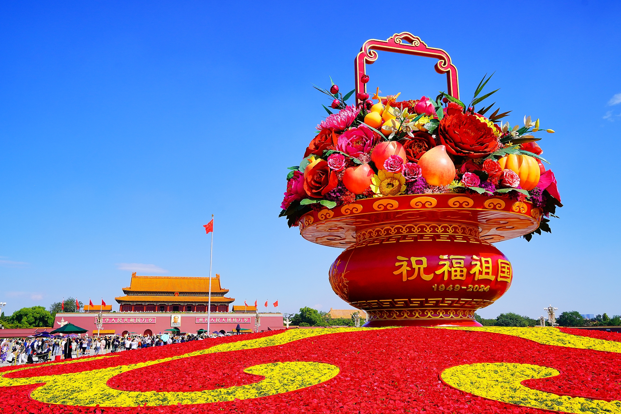 北京:天安門廣場上的“祝福祖國”巨型花籃