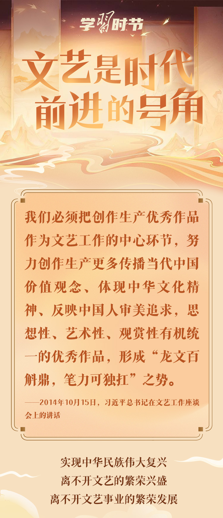 文藝是時(shí)代前進(jìn)的號(hào)角,最能代表一個(gè)時(shí)代的風(fēng)貌,最能引領(lǐng)一個(gè)時(shí)代的風(fēng)氣。十年來,在習(xí)近平總書記的指引下,我國(guó)文藝面貌發(fā)生深刻變化,一系列代表性作品、標(biāo)志性現(xiàn)象和時(shí)代性特征,勾畫了新時(shí)代文藝的獨(dú)特景觀,彰顯了新時(shí)代文藝的豐富內(nèi)涵。