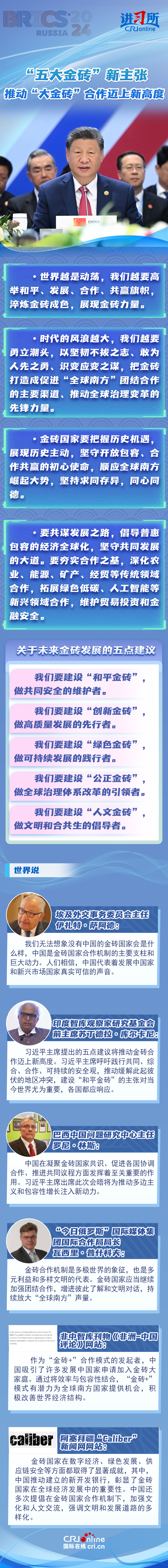 多國人士及媒體盛贊習(xí)近平主席的“五大金磚”建議將推動金磚合作邁上新高度,稱贊中國在凝聚金磚國家共識、促進各國協(xié)調(diào)合作、推進共同議程方面發(fā)揮著至關(guān)重要的作用,代表著發(fā)展中國家和新興市場國家真實可信的聲音。