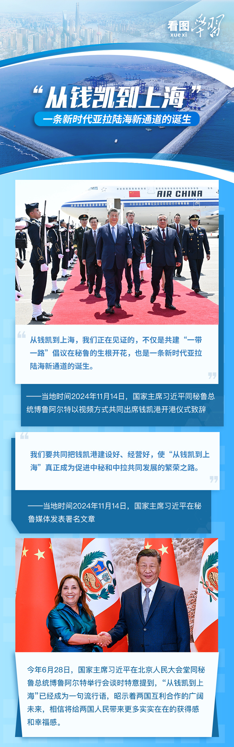 “開(kāi)港!”當(dāng)?shù)貢r(shí)間11月14日,國(guó)家主席習(xí)近平同秘魯總統(tǒng)博魯阿爾特以視頻方式共同出席錢(qián)凱港開(kāi)港儀式。習(xí)主席在致辭中祝賀錢(qián)凱港順利開(kāi)港,對(duì)兩國(guó)建設(shè)者克服疫情困難、齊心協(xié)力、保質(zhì)保量完成各項(xiàng)任務(wù)致以敬意,強(qiáng)調(diào)“我們要共同努力,一道把錢(qián)凱港建設(shè)好、管理好、運(yùn)營(yíng)好,不斷提升運(yùn)能運(yùn)力、提高綜合服務(wù)水平。”