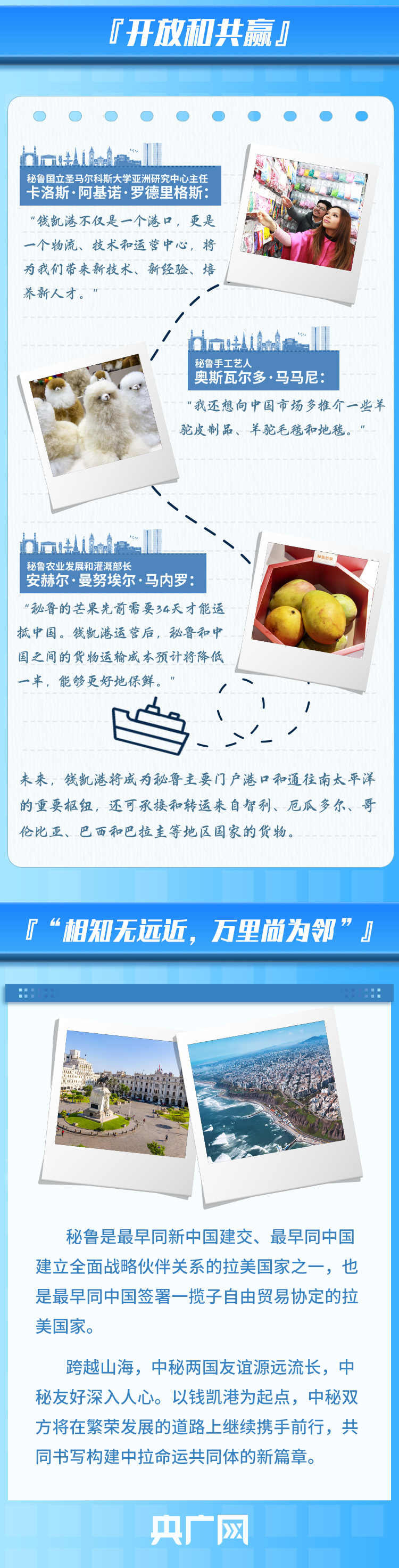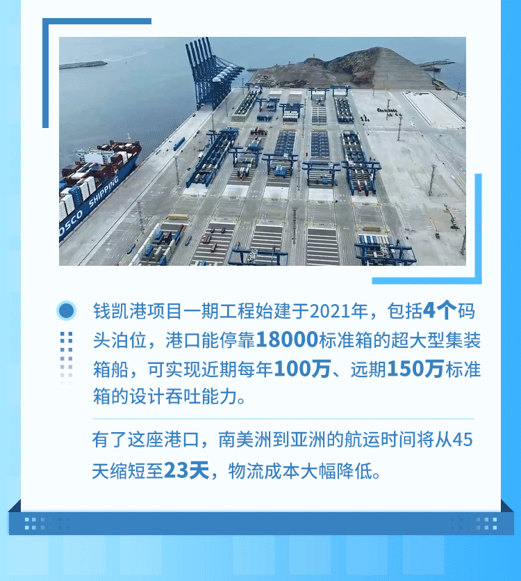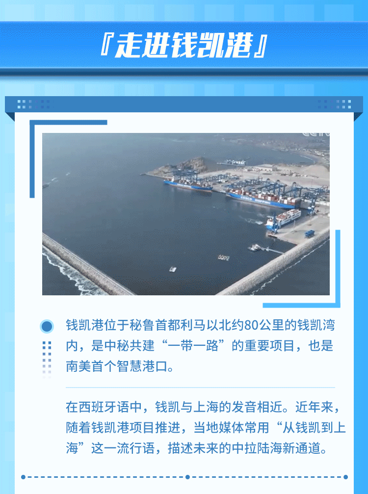 錢(qián)凱港位于秘魯首都利馬以北80公里,是中秘共建“一帶一路”重點(diǎn)項(xiàng)目。開(kāi)港后,中秘間單程海運(yùn)時(shí)間將縮短至23天,節(jié)約20%以上的物流成本,每年將為秘魯創(chuàng)造逾8000個(gè)直接就業(yè)機(jī)會(huì)。