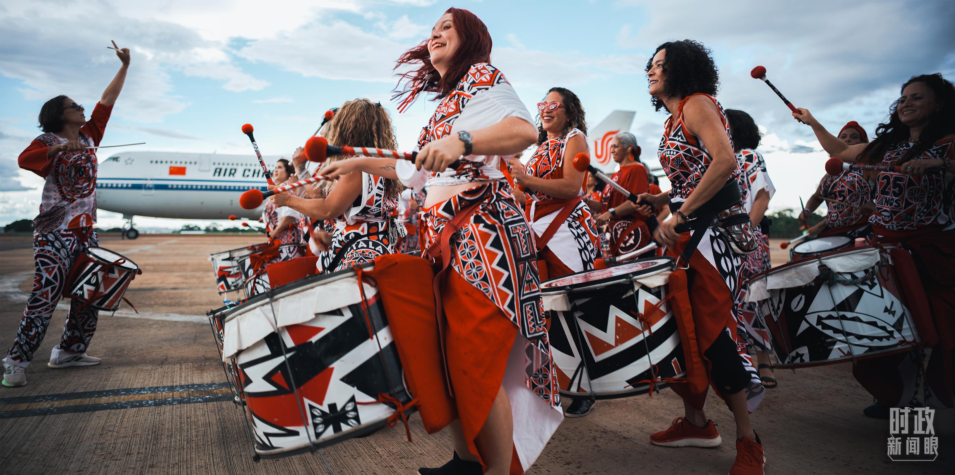 習(xí)主席乘專機(jī)抵達(dá)巴西利亞,藝術(shù)家演奏特色鼓樂(lè)。(總臺(tái)央視記者彭漢明拍攝)
