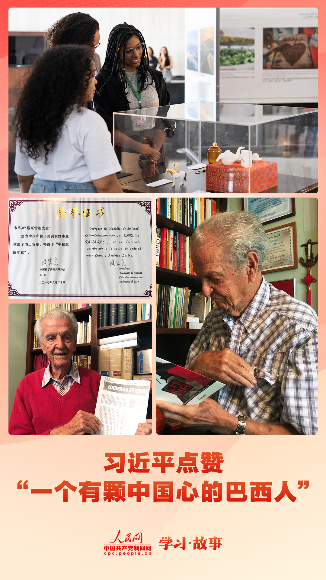 1990年,卡洛斯·塔瓦雷斯受邀來(lái)到中國(guó)?;氐桨臀骱?,他連續(xù)發(fā)表10篇介紹中國(guó)的文章,在整個(gè)拉美地區(qū)引起震動(dòng)。這些文章匯集成冊(cè),成為卡洛斯·塔瓦雷斯撰寫的第一本關(guān)于中國(guó)的書籍——《中國(guó)的覺醒》。此后,這位巴西老人在有生之年始終傾心關(guān)注和研究中國(guó),其間寫下了有關(guān)中國(guó)的10本書和1000余篇文章。