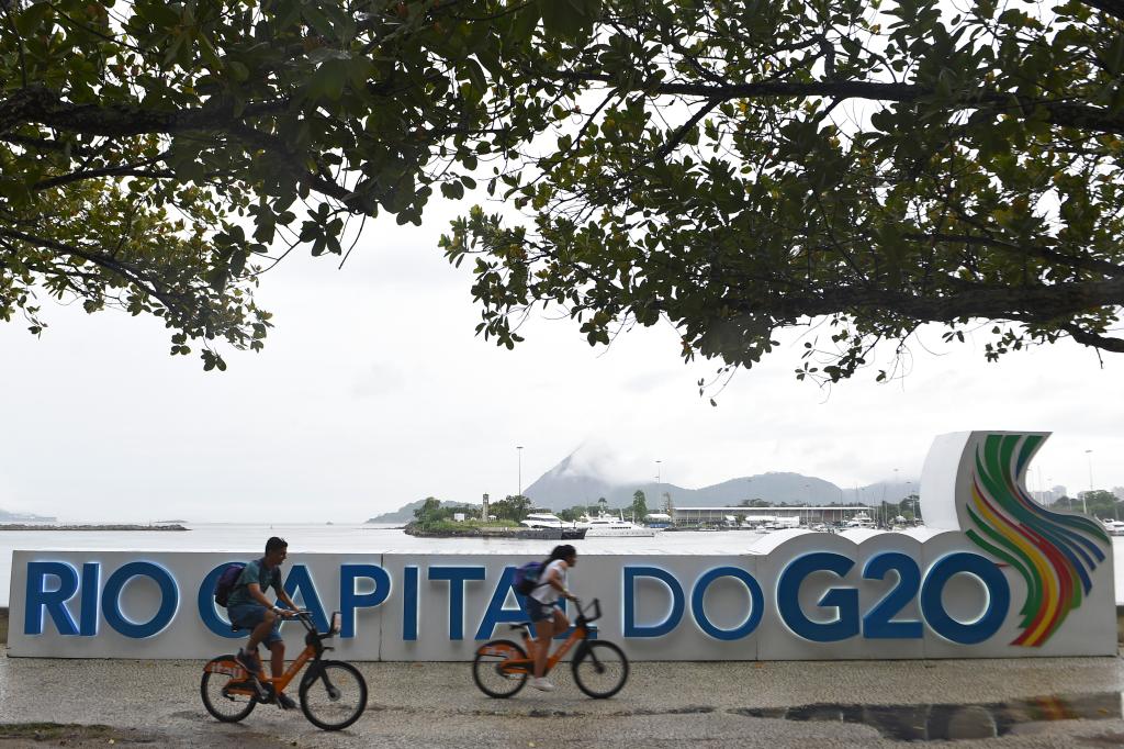 11月16日,在巴西里約熱內(nèi)盧,人們騎車經(jīng)過二十國集團領(lǐng)導(dǎo)人峰會舉辦地附近的峰會標識。新華社發(fā)(盧西奧·塔沃拉攝)