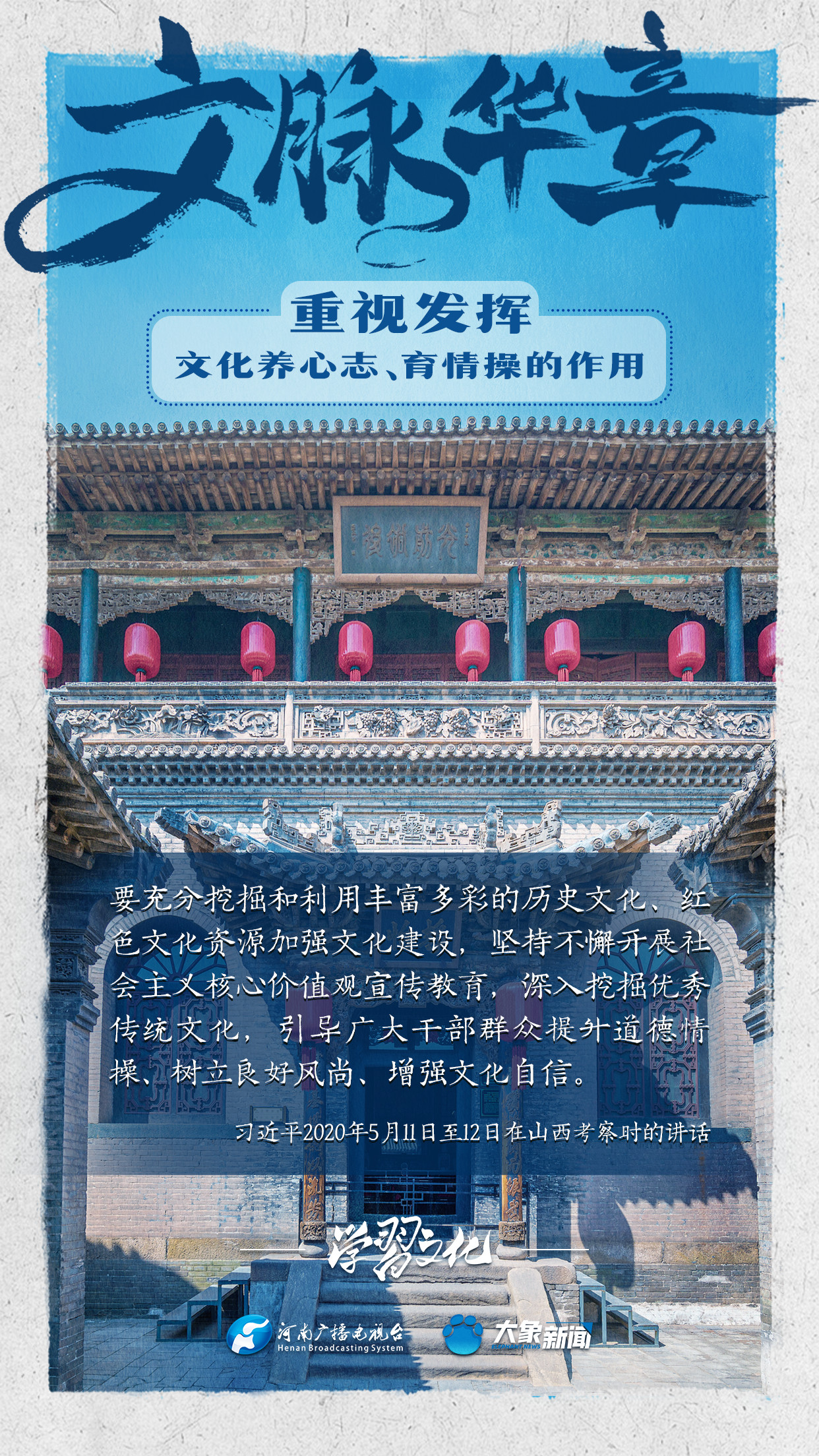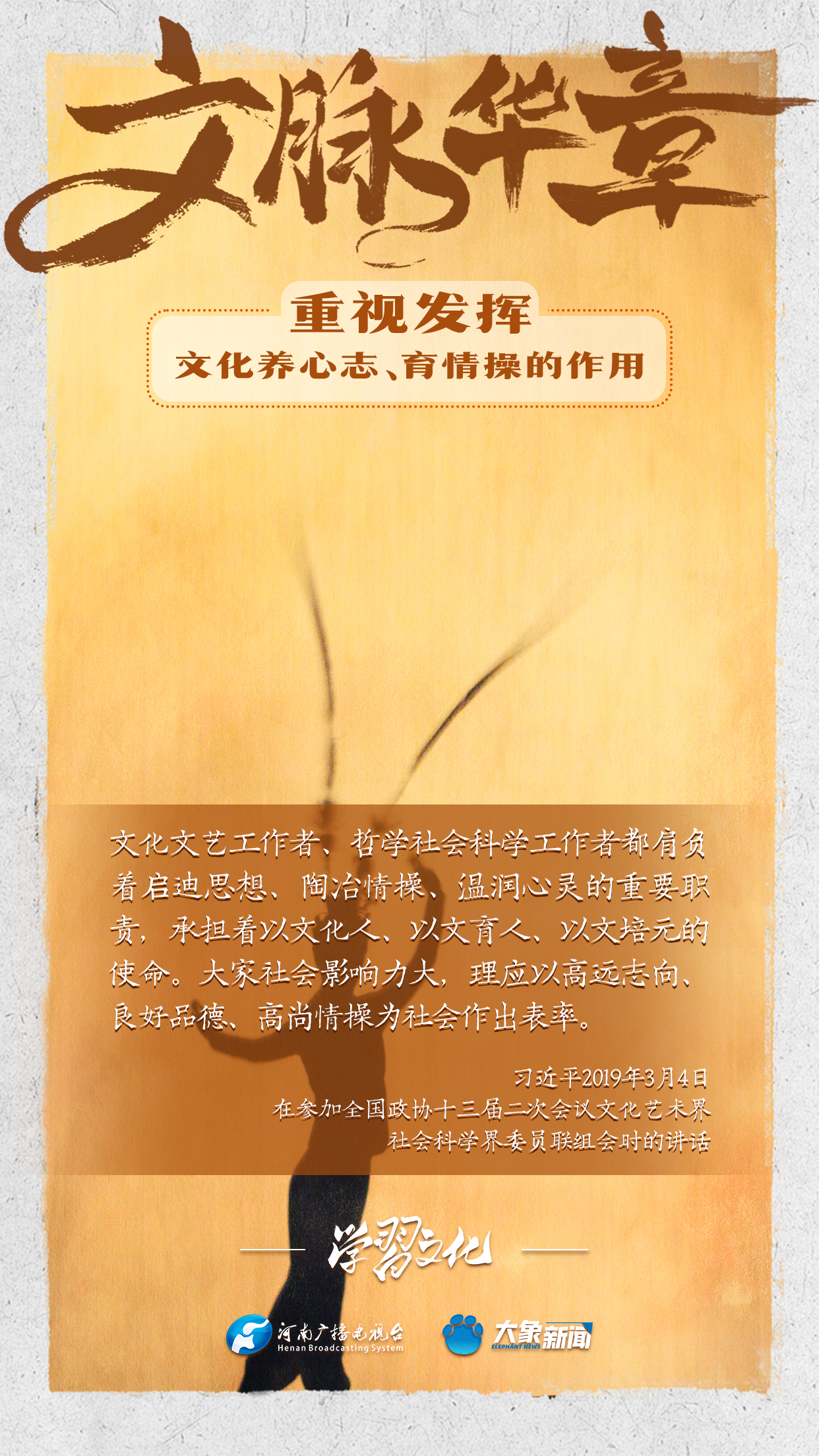 習(xí)近平總書記在主持中共中央政治局第十七次集體學(xué)習(xí)時(shí)強(qiáng)調(diào),重視發(fā)揮文化養(yǎng)心志、育情操的作用,涵養(yǎng)全民族昂揚(yáng)奮發(fā)的精神氣質(zhì)??倳浉叨戎匾曃幕淖饔?,發(fā)表了一系列重要講話,倡導(dǎo)以文載道、以文傳聲、以文化人。我們一起學(xué)習(xí)。