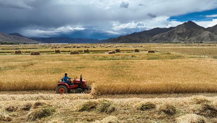 2024年9月10日在西藏日喀則市白朗縣巴扎鄉(xiāng)拍攝的秋收?qǐng)鼍埃o人機(jī)照片)。新華社記者 晉美多吉 攝