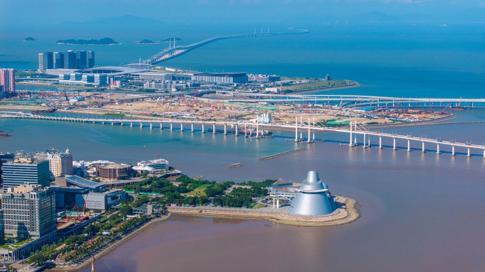 2024年8月3日拍攝的澳門科學(xué)館(前)、澳門新城A區(qū)和港珠澳大橋(后)(無人機照片)。