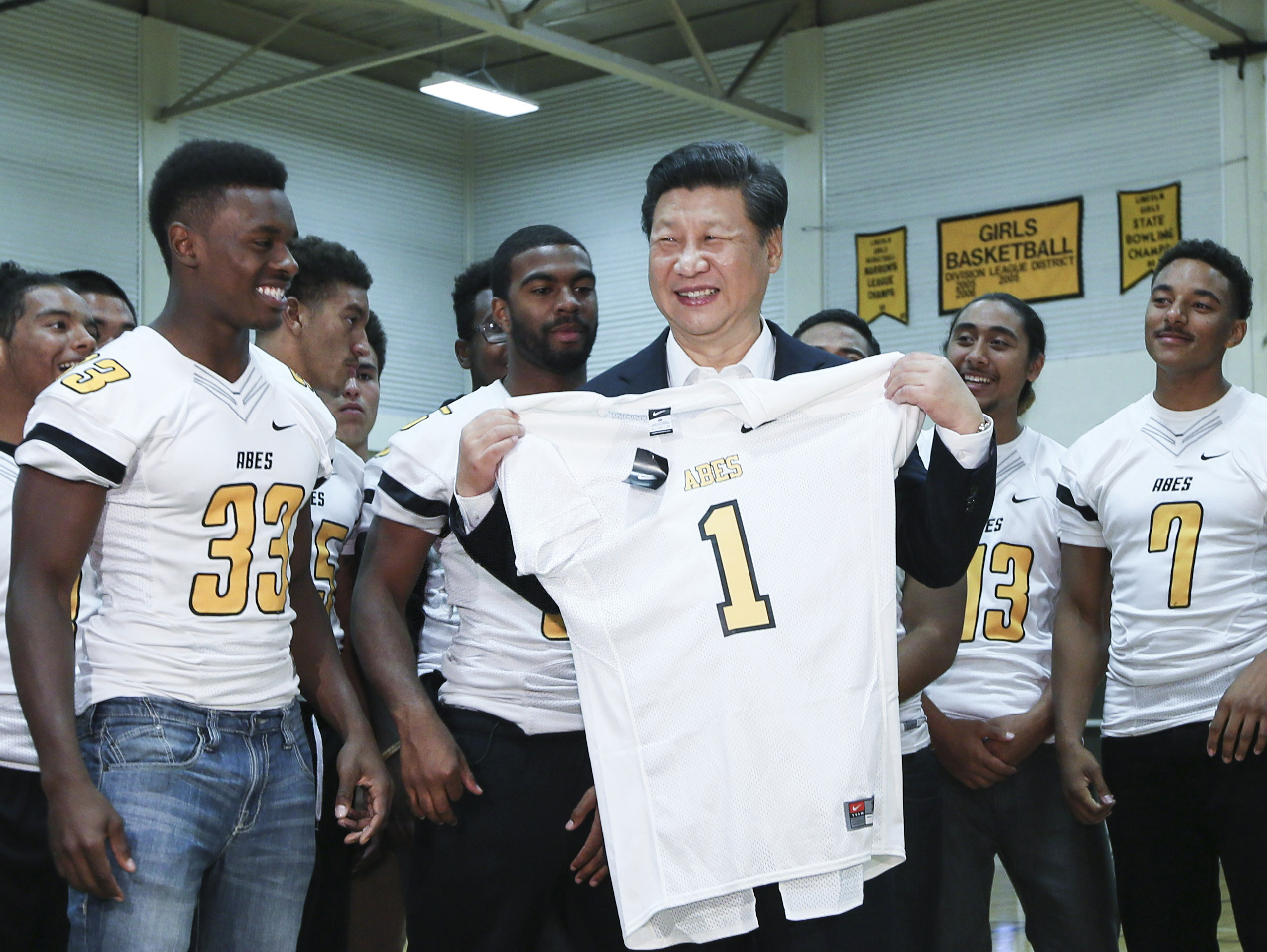 當(dāng)?shù)貢r間2015年9月23日,習(xí)近平主席參觀美國塔科馬市林肯中學(xué)。圖為習(xí)主席接受學(xué)生們贈送橄欖球衣。