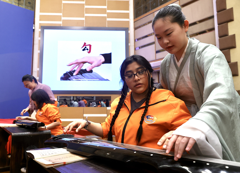 2024年3月20日,美國華盛頓州中學(xué)生代表團北京大學(xué)交流活動在北京大學(xué)英杰交流中心舉行。圖為來自華盛頓州的中學(xué)生體驗古琴。