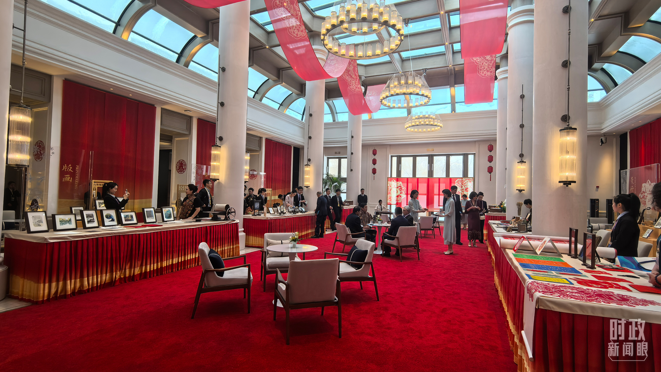 歡迎宴會(huì)開(kāi)始前的黑龍江非物質(zhì)文化遺產(chǎn)展示。(總臺(tái)央視記者史偉、央廣記者馬喆拍攝)