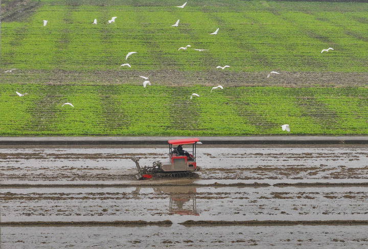 2025年2月25日,在浙江省瑞安市馬嶼鎮(zhèn)儒陽村,農(nóng)機(jī)在田間犁地,白鷺低空而飛(無人機(jī)照片)。