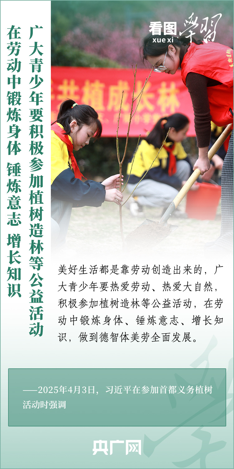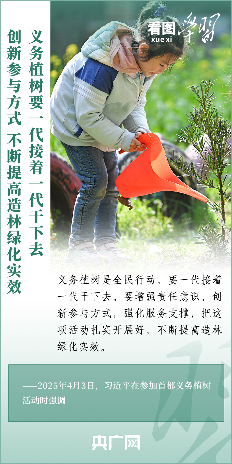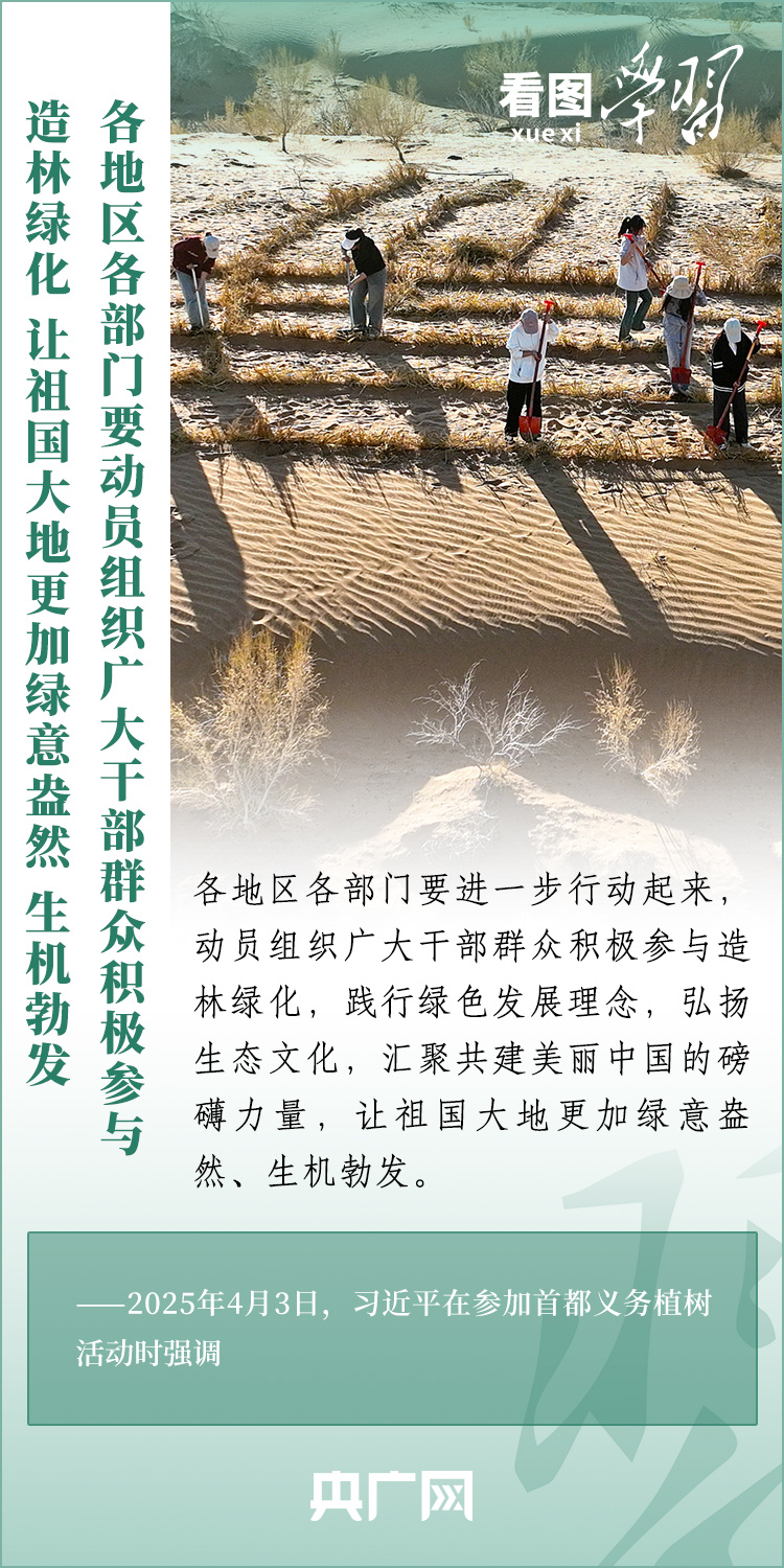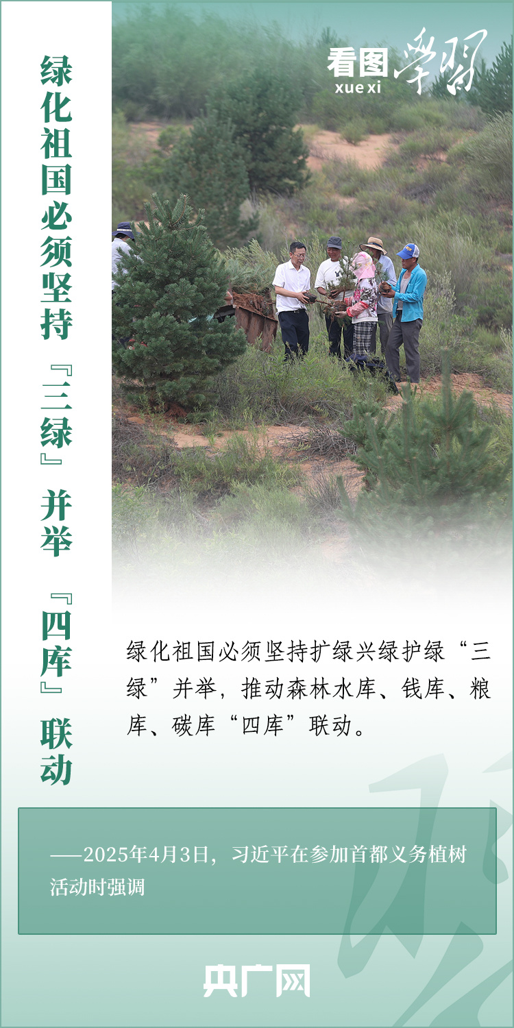 植樹造林是生態(tài)文明建設(shè)重要一環(huán)。4月3日,習(xí)近平總書記參加首都義務(wù)植樹活動(dòng)。在植樹現(xiàn)場(chǎng),總書記高度肯定國(guó)土綠化工作取得來之不易的成績(jī),強(qiáng)調(diào)綠化祖國(guó)必須堅(jiān)持“三綠”并舉、“四庫”聯(lián)動(dòng),要更加注重“提質(zhì)”“興業(yè)”“利民”,“匯聚共建美麗中國(guó)的磅礴力量,讓祖國(guó)大地更加綠意盎然、生機(jī)勃發(fā)”。一起來學(xué)習(xí)!