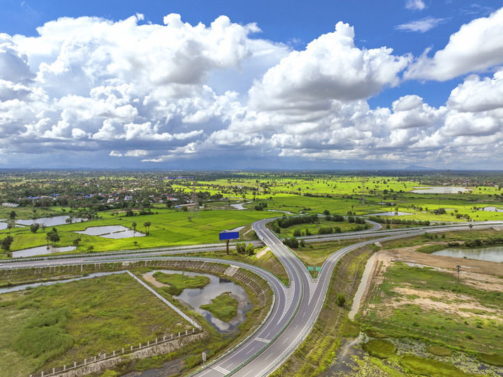 這是2024年9月25日在柬埔寨磅士卑省拍攝的金港高速公路(無人機(jī)照片)。金港高速公路是中國路橋工程有限責(zé)任公司(中國路橋)按“建造-運(yùn)營-移交”模式投資的項(xiàng)目。