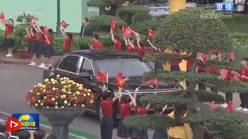 歡迎儀式后,習(xí)近平和蘇林一同步行前往越共中央駐地舉行會(huì)談。沿途數(shù)百名越南民眾揮舞兩黨兩國(guó)旗幟,對(duì)習(xí)近平表示最熱烈的歡迎。習(xí)近平向歡迎人群揮手致意。