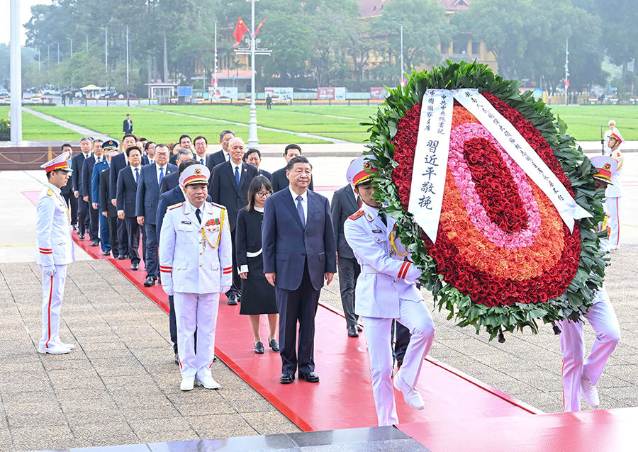 2023年,習(xí)近平總書(shū)記在訪越期間來(lái)到巴亭廣場(chǎng),沿著載有無(wú)數(shù)歷史印記的石板路,前往胡志明陵敬獻(xiàn)花圈,追思緬懷。