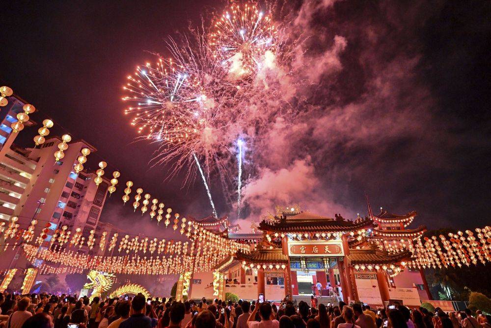 2024年2月24日,馬來西亞首都吉隆坡天后宮的煙花表演,吸引眾多市民到場(chǎng)一同慶祝元宵佳節(jié)。