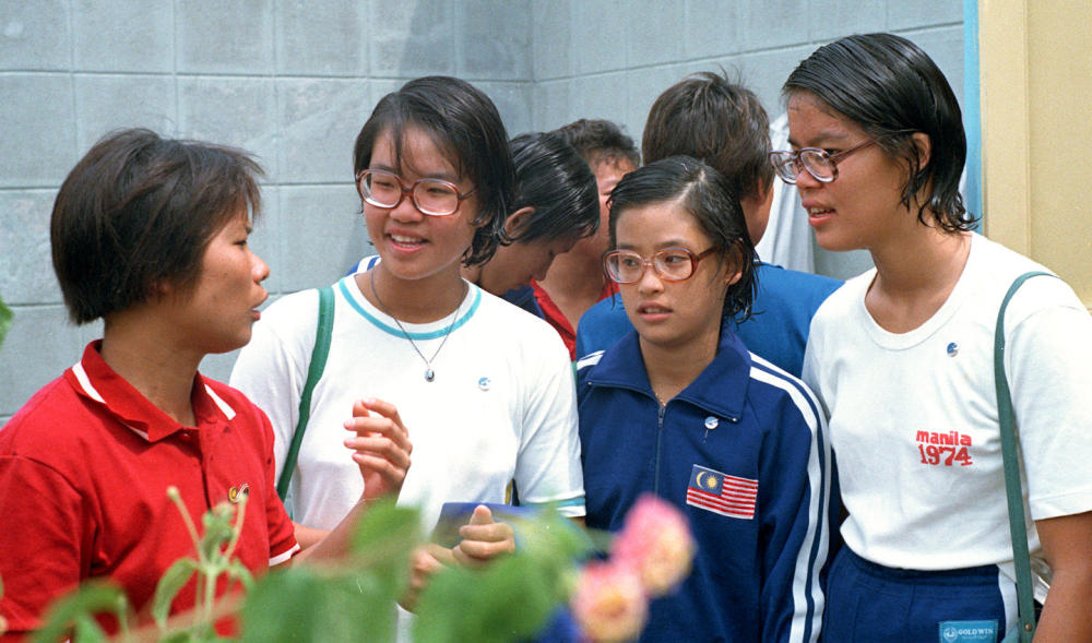 1975年8月2日至8月10日,北京國際游泳、跳水友好邀請(qǐng)賽舉行。一同參加這次邀請(qǐng)賽的馬來西亞游泳三姐妹林寶齡(前右二)、林愛齡(前右一)、林勇齡(左二)和中國運(yùn)動(dòng)員葉玩嫦親切交談。