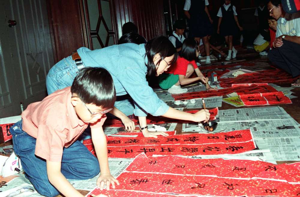 1995年,馬來西亞小書法愛好者揮筆獻(xiàn)技,書寫漢語條幅。