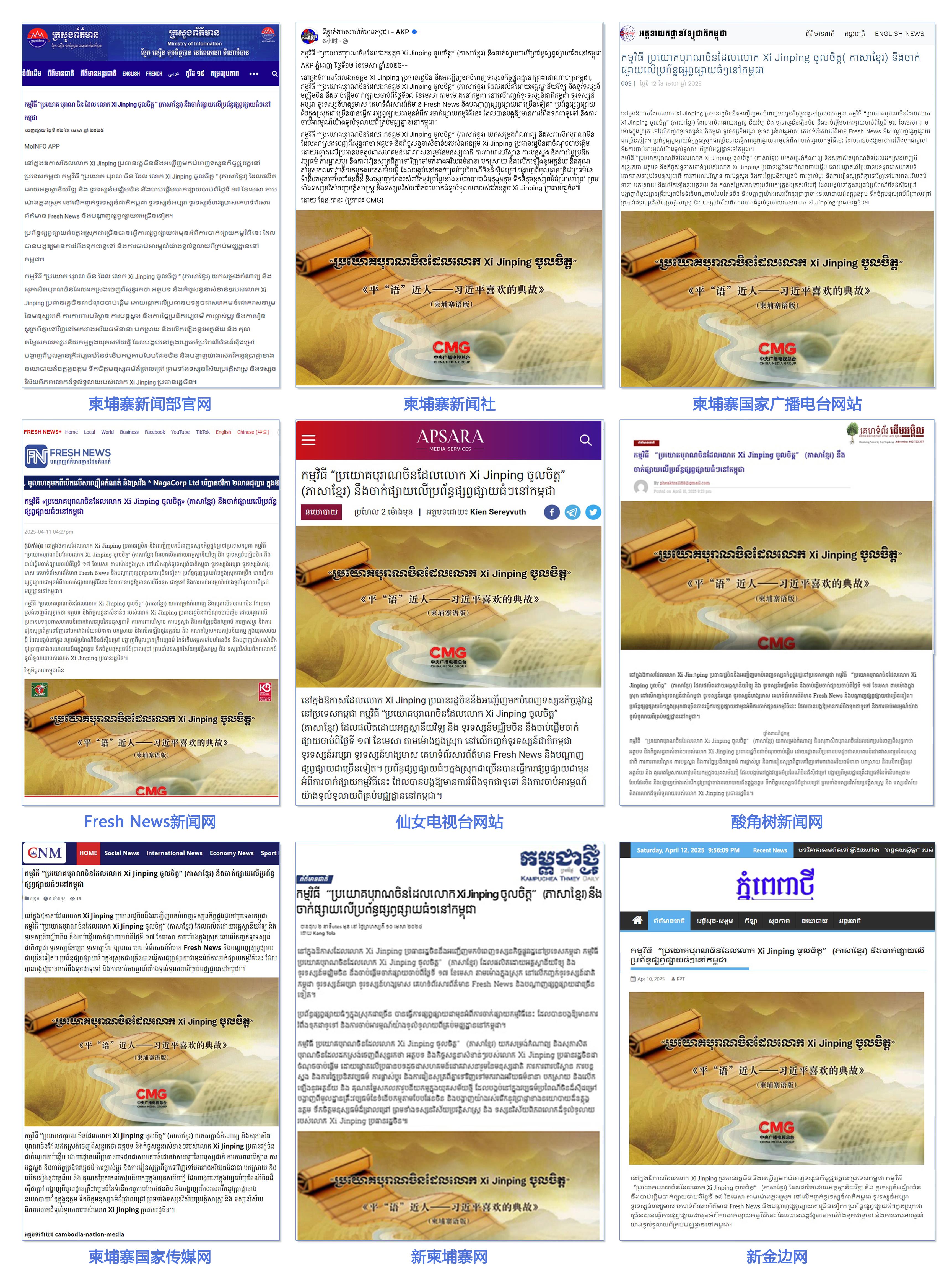 柬埔寨新聞部官網(wǎng)、柬埔寨新聞社、柬埔寨國(guó)家廣播電臺(tái)網(wǎng)站、Fresh News新聞網(wǎng)、仙女電視臺(tái)網(wǎng)站、柬中記協(xié)網(wǎng)站、酸角樹新聞網(wǎng)、柬埔寨國(guó)家傳媒網(wǎng)、新柬埔寨網(wǎng)、新金邊網(wǎng)、《金邊日?qǐng)?bào)》網(wǎng)等柬主流媒體發(fā)布相關(guān)報(bào)道。