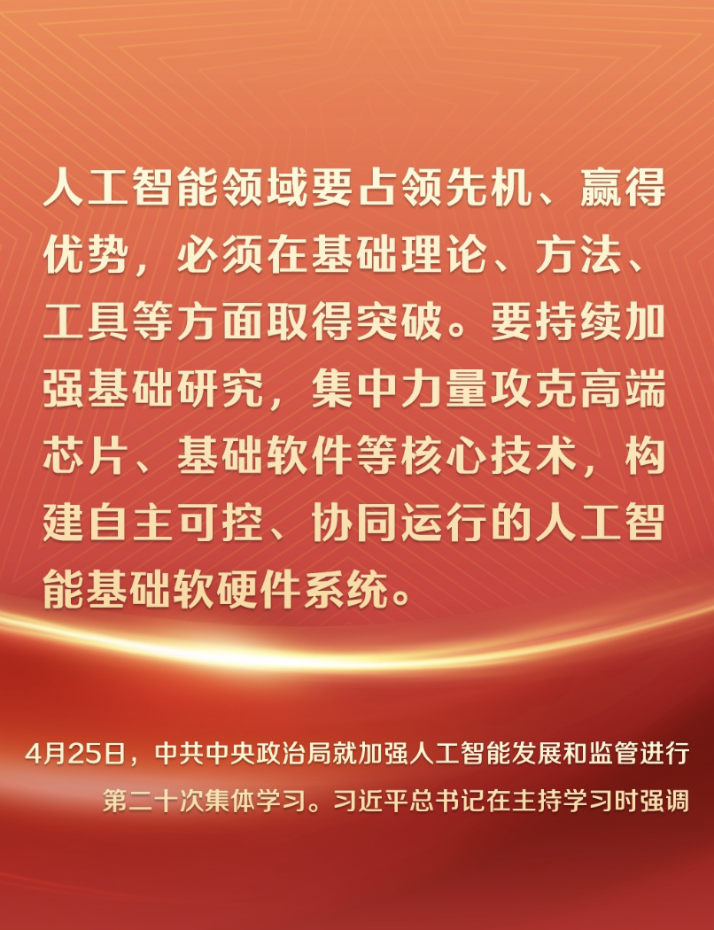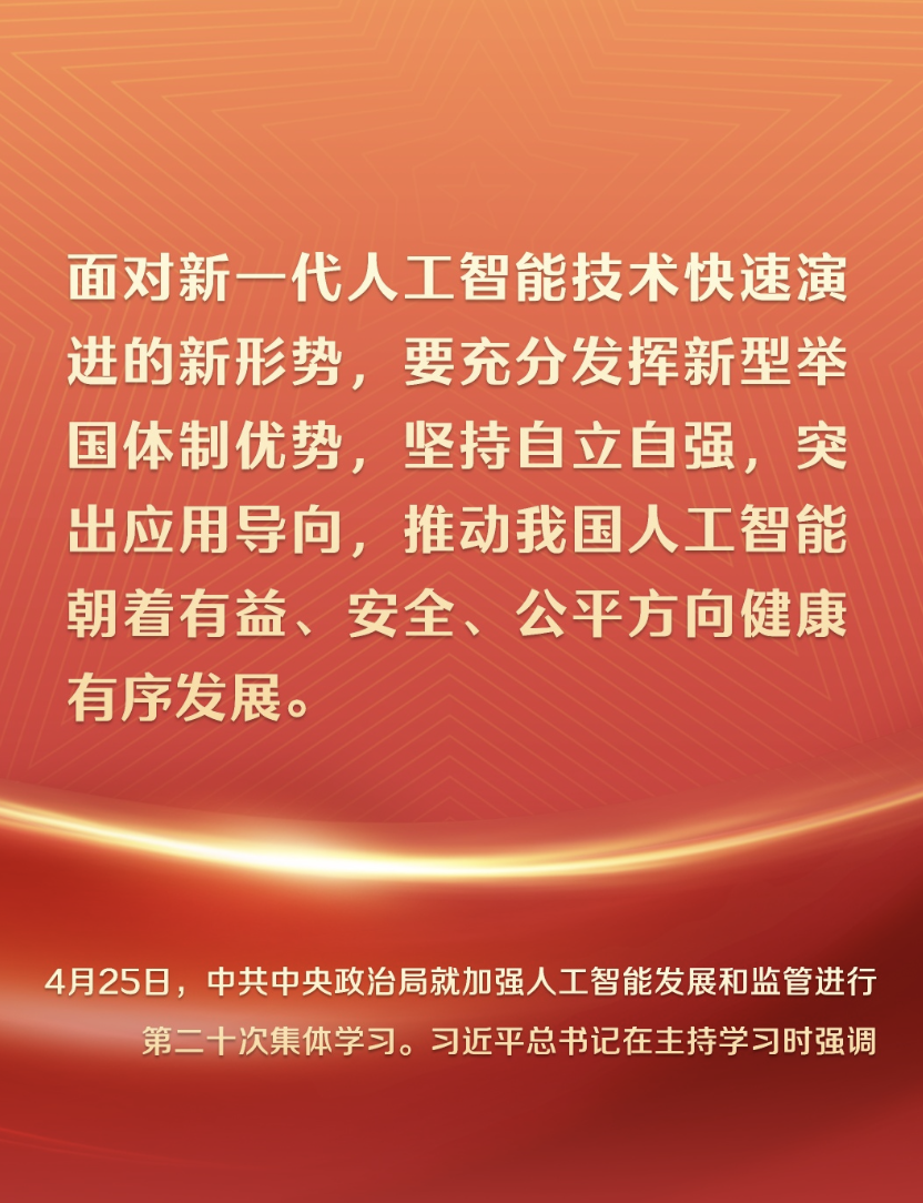 就在4天前,4月25日下午,中共中央政治局就加強(qiáng)人工智能發(fā)展和監(jiān)管進(jìn)行第二十次集體學(xué)習(xí)。習(xí)近平總書記在主持學(xué)習(xí)時(shí)強(qiáng)調(diào):