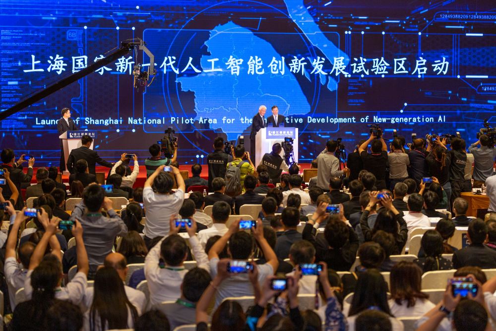 在上海舉行的2019浦江創(chuàng)新論壇全體大會(huì)上,科技部與上海市政府共同啟動(dòng)上海國(guó)家新一代人工智能創(chuàng)新發(fā)展試驗(yàn)區(qū)建設(shè)(2019年5月25日攝)。