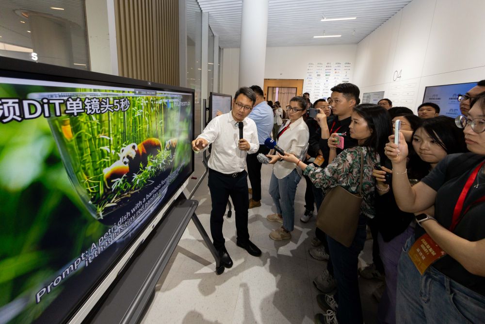 2024年5月23日,在“模速空間”,工作人員為采訪團(tuán)介紹運(yùn)用大模型文生視頻。