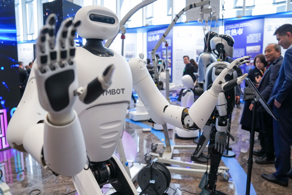 2025年2月14日,在2025年蘇州市“人工智能+”創(chuàng)新發(fā)展推進(jìn)大會(huì)暨人工智能賦能新型工業(yè)化深度行(蘇州站)活動(dòng)現(xiàn)場(chǎng)拍攝的人形機(jī)器人。