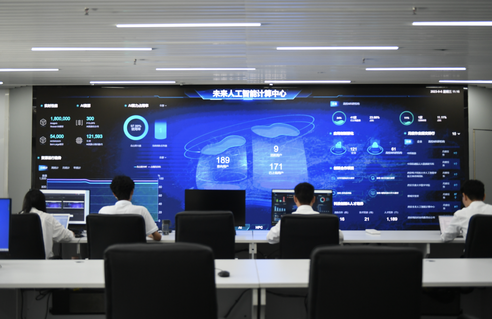 2023年9月6日,在陜西西安的未來人工智能計(jì)算中心監(jiān)控運(yùn)維室,工作人員通過智慧大屏監(jiān)測(cè)平臺(tái)運(yùn)行情況。
