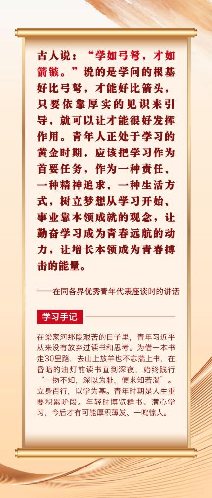 “青年者,國家之魂?!鼻嗄暌淮院畏N精神風貌站上時代舞臺,關(guān)乎祖國的明天、民族的未來。黨的十八大以來,習近平總書記圍繞青年成長成才作出許多重要論述。其中,有信手拈來的精妙典故,有貫古通今的廣征博引,引領(lǐng)廣大青年不斷在中華文化的浸潤中堅定中國心、涵養(yǎng)民族魂,成長為堪當復興重任的時代新人。