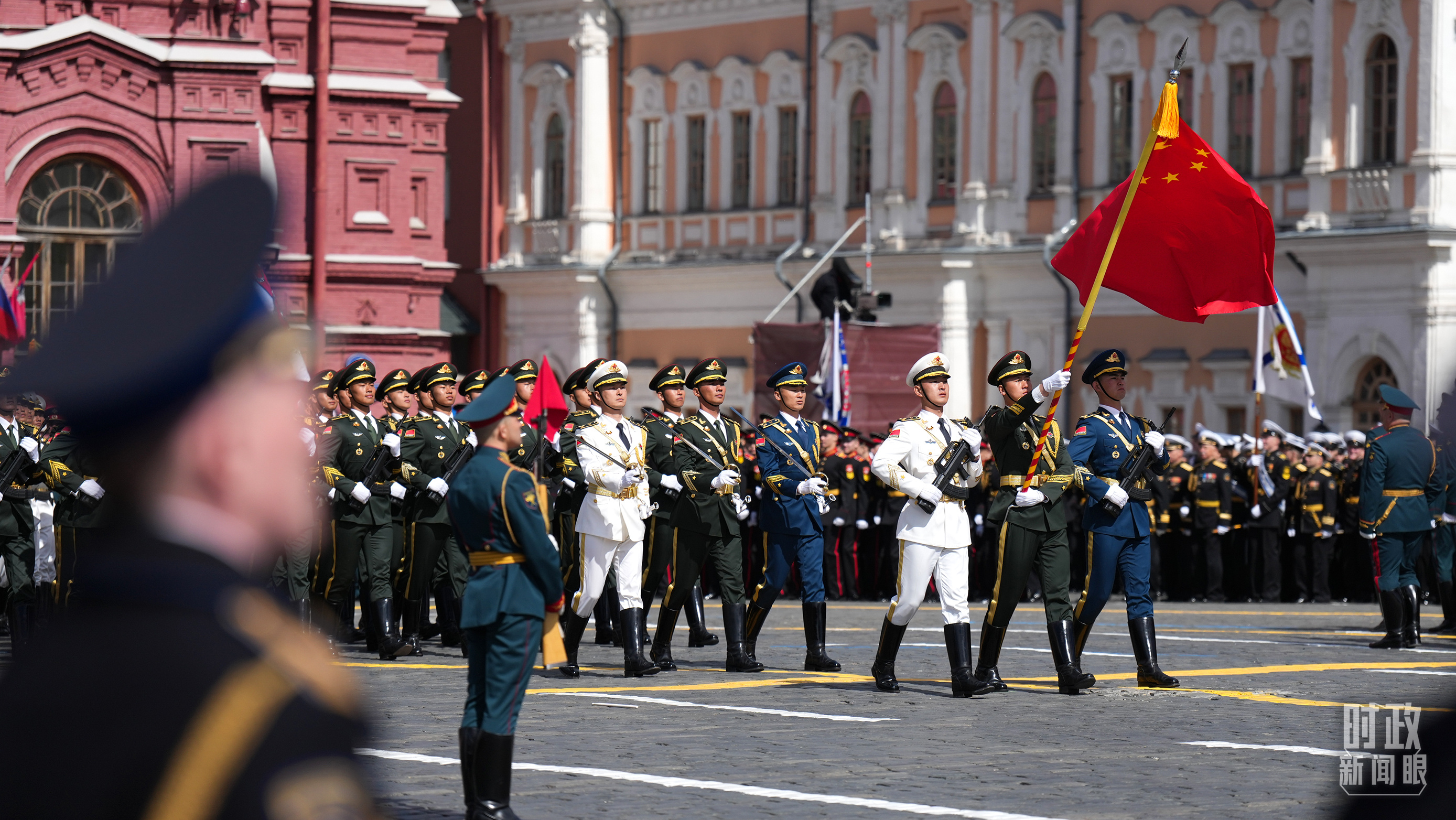 中國人民解放軍三軍儀仗隊方隊軍容嚴(yán)整、士氣高昂,邁著堅定有力的步伐走過紅場。(總臺記者李晉拍攝)
