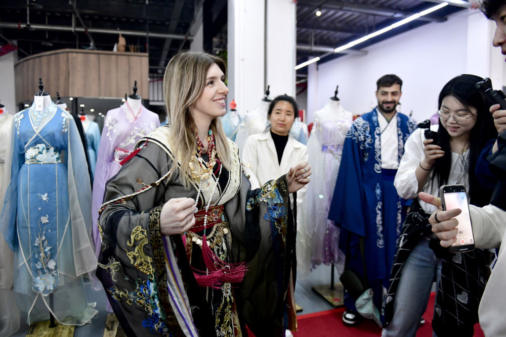 2025年4月8日,參加曹縣漢服文化節(jié)的意大利嘉賓卡米拉在試穿漢服。新華社記者郭緒雷 攝