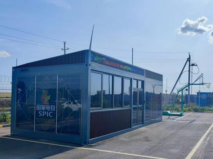 國家電投哈薩克斯坦能源投資公司阿克莫拉項目部負責(zé)人蔡慧勇介紹安全小屋和項目整體情況。本報記者 李洋 攝
