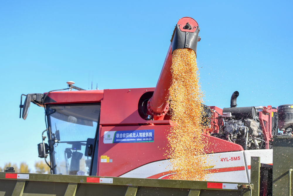 2023年10月19日,在中國(guó)科學(xué)院“黑土糧倉”科技會(huì)戰(zhàn)長(zhǎng)春示范區(qū)公主嶺示范基地,無人駕駛農(nóng)機(jī)將收獲的玉米裝車。
