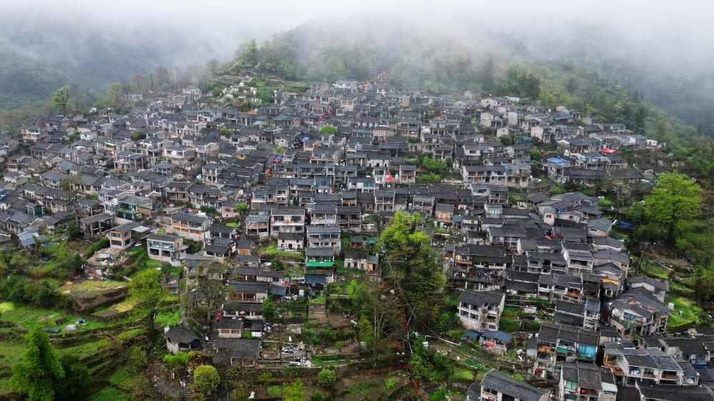 2025年3月30日,在廣東省清遠(yuǎn)市連南瑤族自治縣三排鎮(zhèn)南崗村拍攝的云霧中的千年瑤寨。
